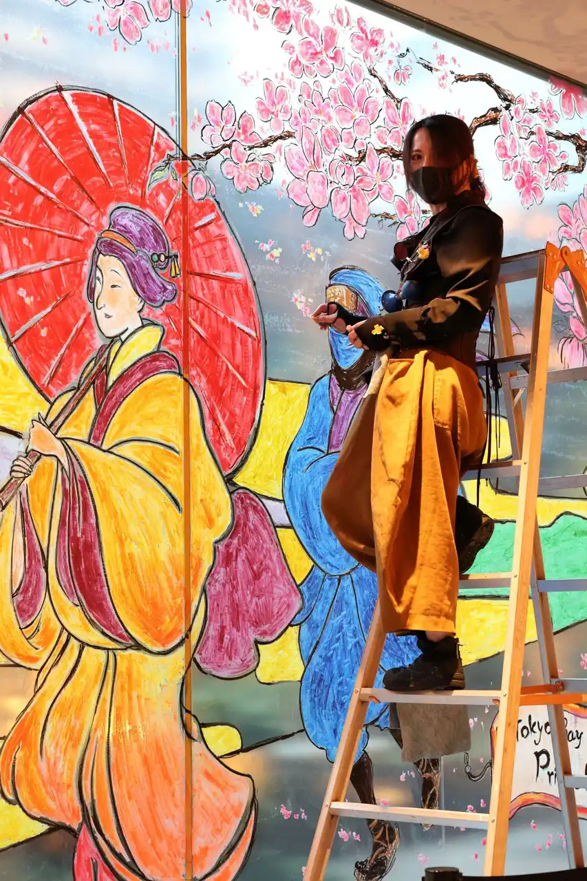 海外のお客様にも美しい春の日本を感じていただけるように、浮世絵をイメージした桜と江戸のデザインで描きました。キットパスの鮮やかな発色は和風のグラデーションにも相性が良く、ゲストのみなさまからも色使いへの驚きの声かけをいただきました。 線画が完成し富士山に色が入り全体に輝くようなキットパスのきいろのエ霞文(えがすみもん)が入っていくライブドローイングの過程は盛り上がりのある行程なので理化学工業の皆さんがお手伝いや対応をしてくれたこともあり、反応がひときわ大きく感じられました。