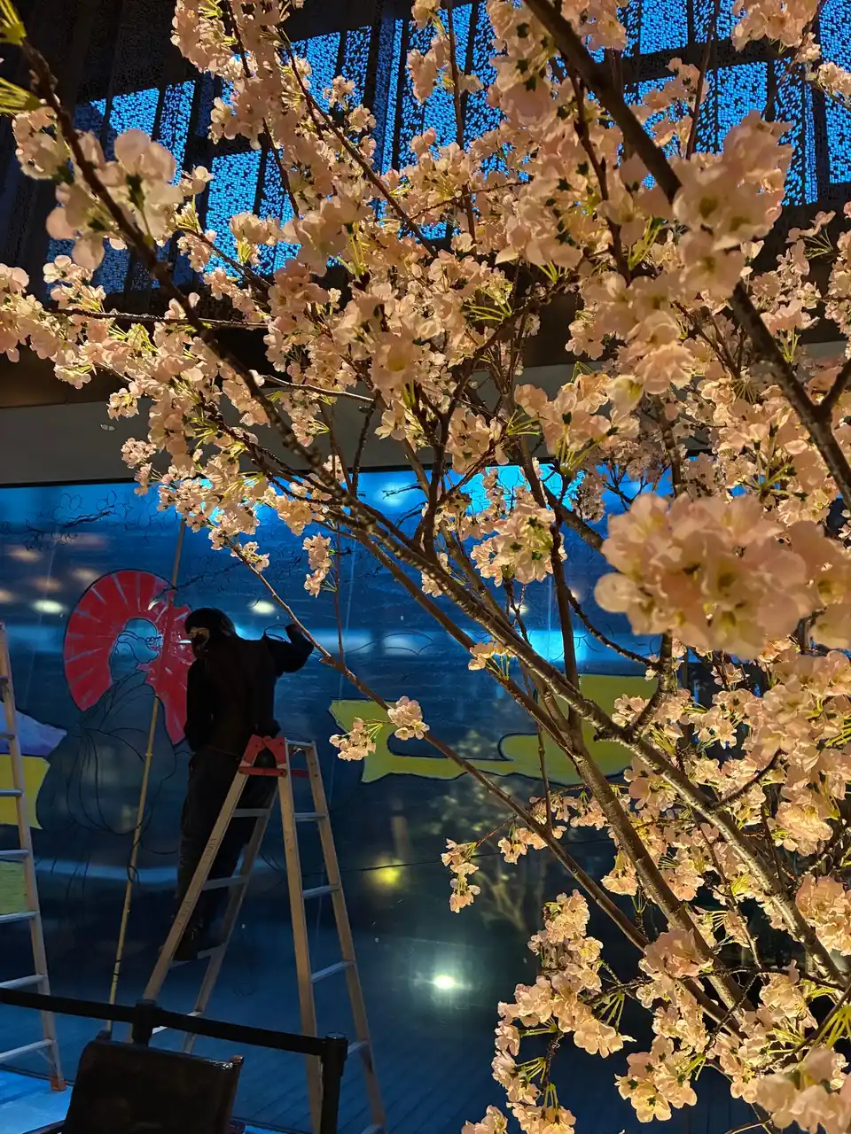 ロビーには、季節ごとに装いを変える華やかな桜の植栽がレイアウトされており、マツナガ氏が描く『爛漫 -Ranman-』と見事に調和しています。平面のアートと立体の植物が融合することで、ロビー全体が春のエネルギーに満ちた没入感のある空間へと昇華されました。 |