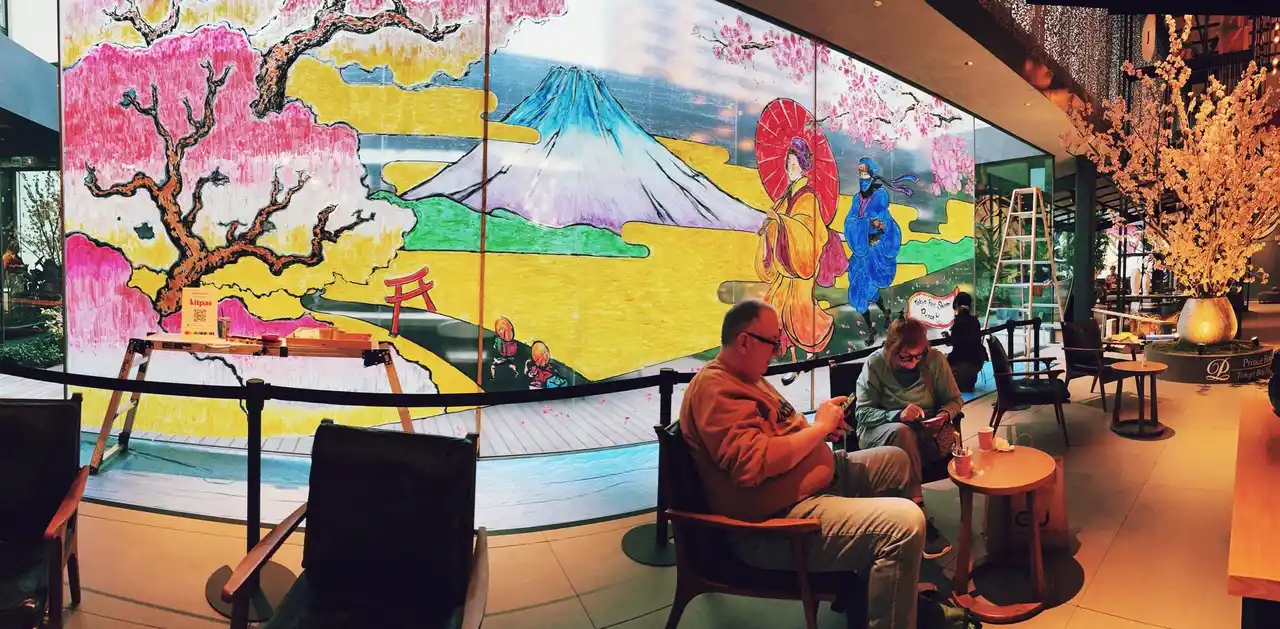 「ホテルで、しかもライブでアートが見られるとは想像もしていなかった。1日目の朝の下描きから、徐々に色がつき、富士山と桜が完成していく過程は圧巻で、家族とともにここでずっと見ている。アートの完成前に帰国してしまうのが残念。WEBやSNSでの発信を楽しみにしている。」 |
