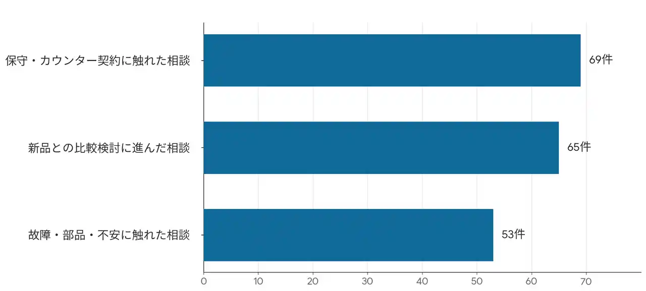 分析の結果、複合機(コピー機)の「中古検討」に関する相談は71件確認され、全体の約67%を占めました。 これは、中古複合機が導入時の比較対象として広く検討されていることを示しています。 |
