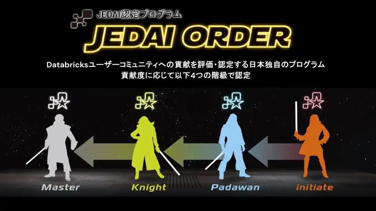 JEDAI Order(JEDAI認定プログラム)は、Databricks Japanユーザーコミュニティへの貢献を評価・認定する日本独自のプログラムです。貢献度に応じて以下4つの階級で認定が行われます。今回の選考対象期間は2025年の活動実績です。2026年度は全国26名が選出され、最高位のMasterはそのうち3名の認定となっています。 |