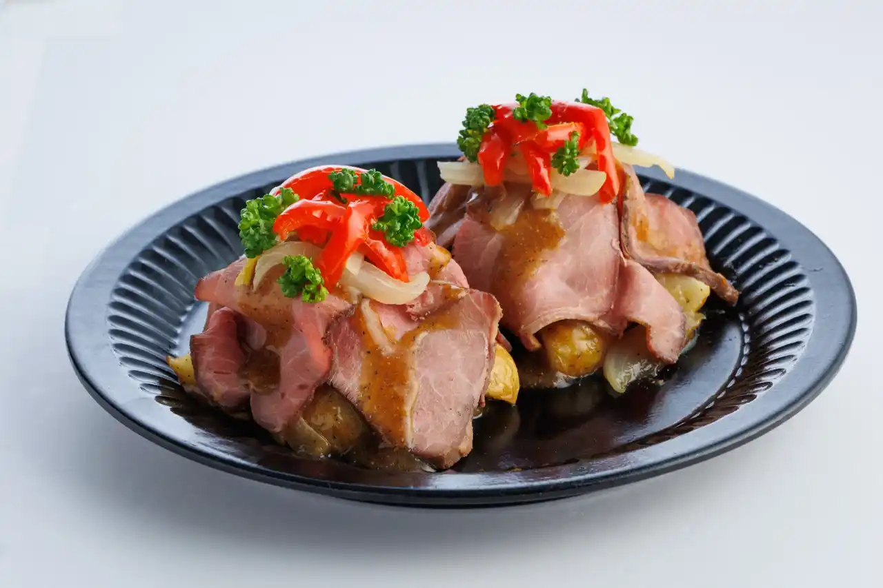 直火で香ばしく仕上げたローストビーフに、グリルしたじゃがいも、たまねぎ、パプリカを合わせ、醤油ベースの和風ソースで仕上げた和風テイストの一品です。 |