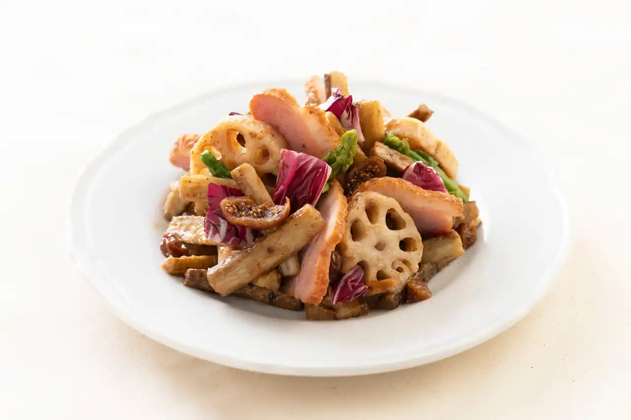 大きめにカットして焼いたごぼうとれんこんに、バルサミコビネガーとオリーブが薫るドレッシングを合わせました。ごぼう特有の土の香りに似た風味と、ケンコーマヨネーズの『オリーブ&バルサミコビネガードレッシング』の酸味と深みのある風味がよく合い、奥行きのある味わいを生み出します。ドライいちじくの甘味がアクセントになっています。しっとり柔らかな合鴨ローストと、ごろごろとした根菜の食感も楽しい一品は、ワインのお供としてもぴったりです。 |