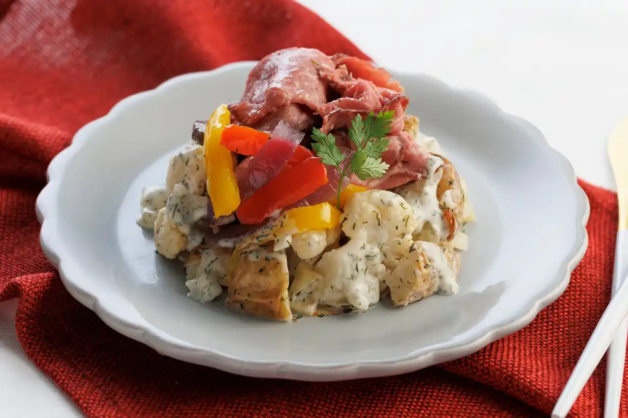 炭火焼ローストビーフと焼き野菜を、ディルが香るクリーミーなソースで和えた、華やかなパプリカが特長のデリ風サラダです。 |