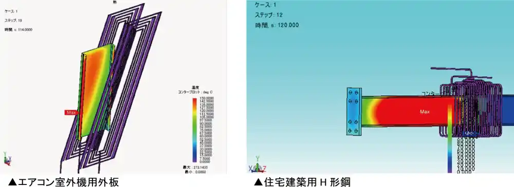 金属部品とコイルの距離によって電磁波の伝わりやすさ(温度)が変わるため、同一ラインで厚物を短時間で加熱しようとすると薄物は温度が上がりすぎるといった品質課題があります。そのような課題解決のために対象物に合わせて効率的に加熱できるフレキシブルなコイルも設計(特開2022-021618)、CAE解析を実施いたします。 当社は今後も、画期的なソリューションの普及を通じて、持続可能な産業構造への移行とお客様の脱炭素経営に貢献してまいります。 |