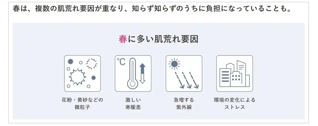 また、dプログラムは、春には肌荒れ要因が複数あることに着目。花粉や黄砂などの微粒子・紫外線など、春の複合悩みに対応したコミュニケーションを展開します。 |