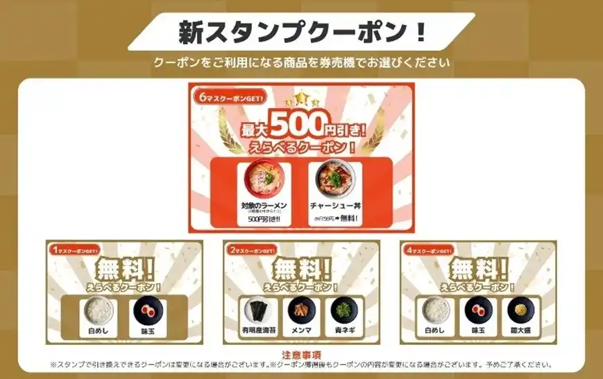 | ご来店時に食券に記載されているナンバーをアプリに入力していただくと、スタンプを1個ためることができます。スタンプは全6マスとなっており、1・2・4・6マス達成時に、それぞれおトクなクーポンを獲得することができます。 | |||