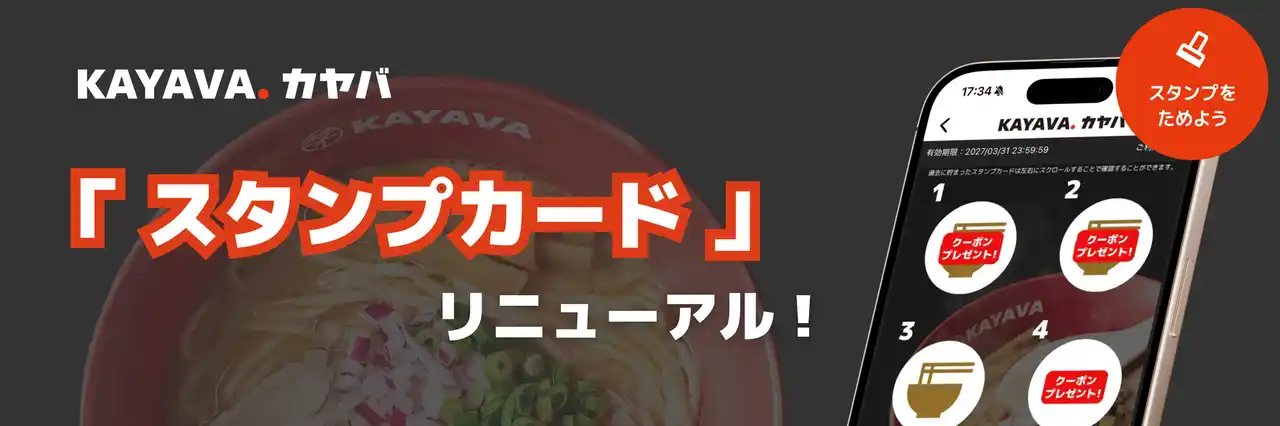 | このたび「KAYAVA.総本店」では、4月1日(水)より公式アプリ機能の一つである『スタンプカード』をリニューアルいたします。これまでよりもスタンプがたまりやすく、特典もお楽しみいただきやすい内容へと変更いたしました。ぜひこの機会に、KAYAVA.公式アプリをご利用いただき、食事とあわせてスタンプカードもお楽しみください。 | |||