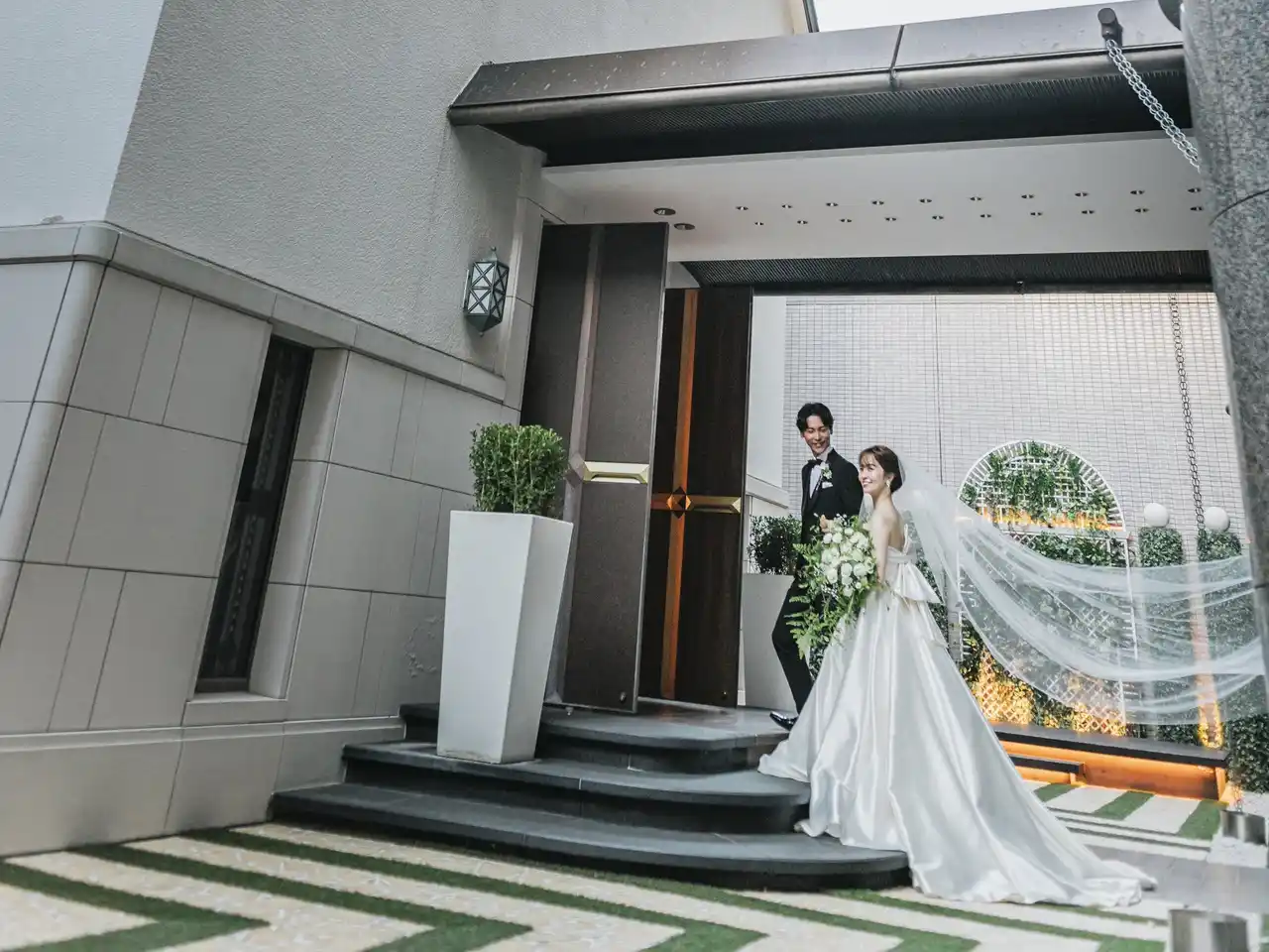チャペルへと続く幾何学的な石畳と鮮やかなグリーンのエントランスは、ホテル内にありながら他の誰の視線も気にすることのない完全プライベート空間。大切なゲストと心置きなく過ごせるアフターセレモニーの舞台や、絶好のフォトスポットとしても人気を集めています。 |