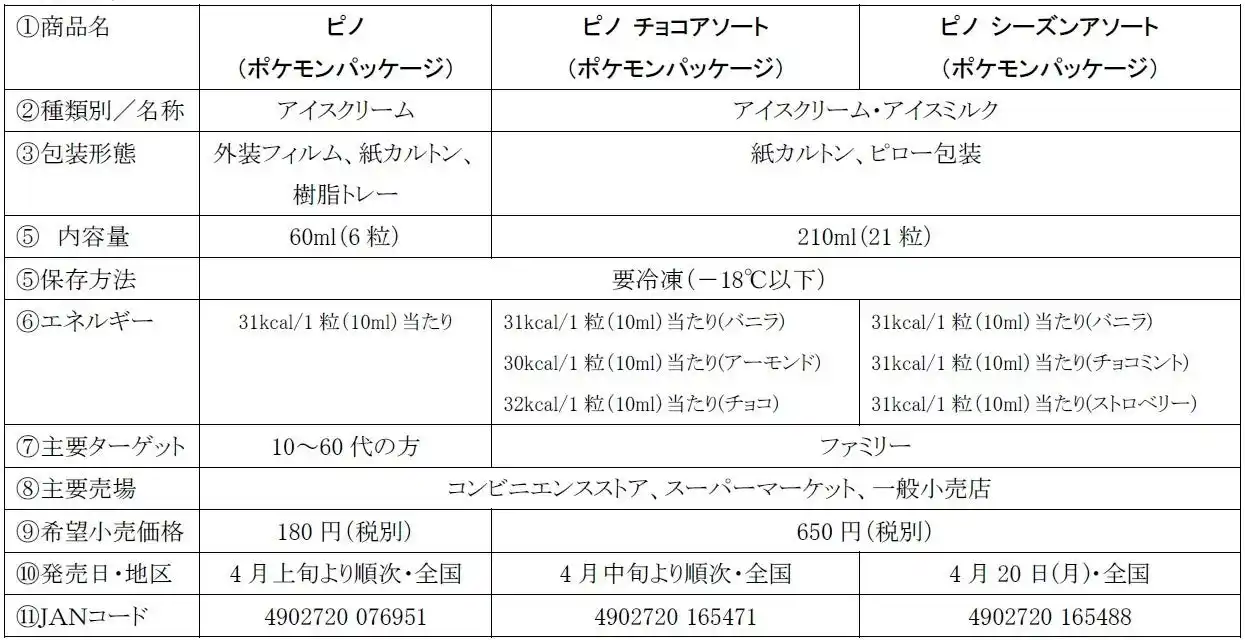 森永乳業は、ロングセラーブランド「ピノ」シリーズから、ポケットモンスター(以下、ポケモン)のポケモンたちが登場する「ピノ (ポケモンパッケージ)」を4月上旬より順次、「ピノ チョコアソート(ポケモンパッケージ)」を4月中旬より順次、「ピノ シーズンアソート(ポケモンパッケージ)」を4月20日(月)より、全国にて数量限定発売いたします。 |