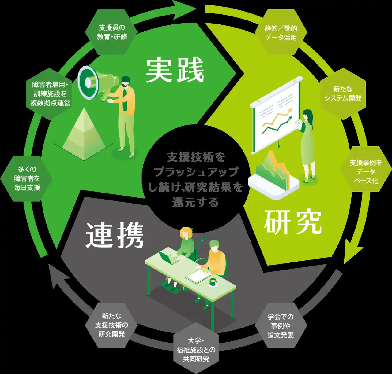 障害者雇用に関する総合コンサルティングを軸に、屋内農園型障害者雇用支援サービス「IBUKI」、ロースタリー型障害者雇用支援サービス 「BYSN」、企業/障害当事者向けカスタマイズ研修、在宅雇用支援、障害者採用支援などサービスメニューを拡充しています。一つでも多くの選択肢をつくり、多様な人々の可能性を拡張することで、誰もが自分らしく生きる社会を目指しています。 |