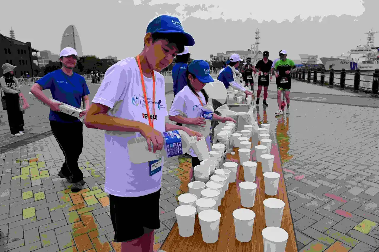 みんなの応援が選手のパワーになる!競技中の選手に沿道から水を手渡したり、フィニッシュ後の選手に水やバナナなどを渡したりします。 |