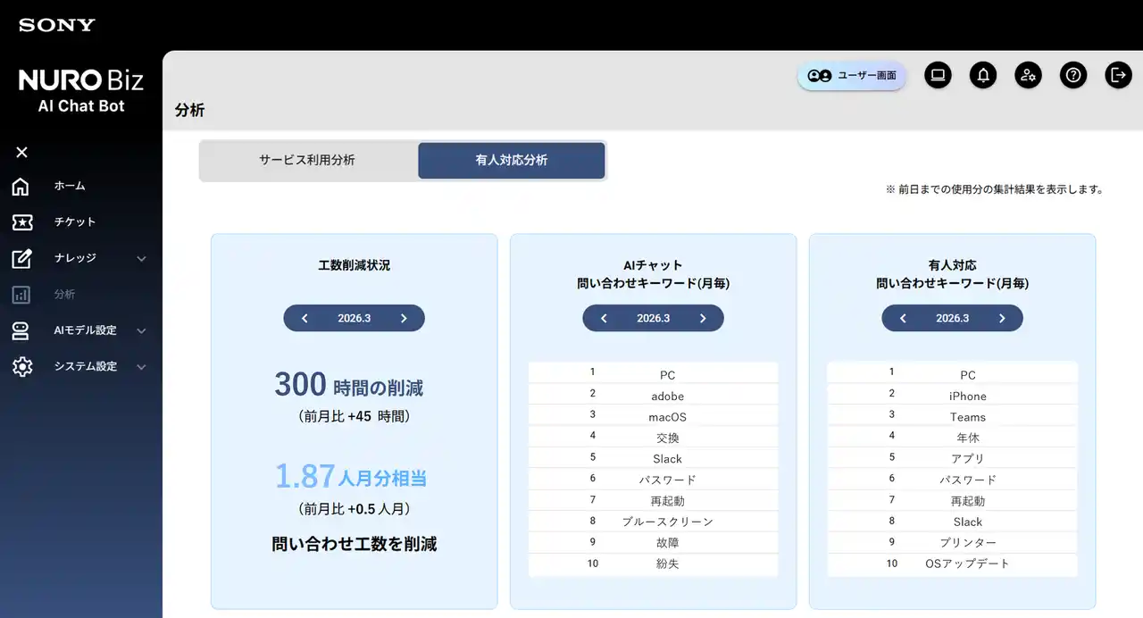 月に何時間・何人分の問い合わせ対応工数を削減できたかをグループごとに算出し、可視化する分析機能を追加いたしました。 |