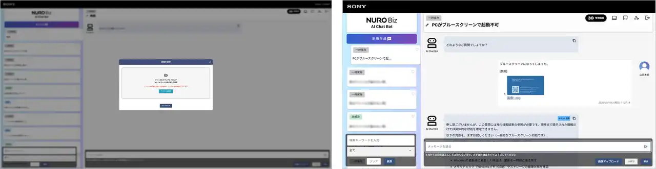 左:画像データはチャット画面にドラックアンドドロップまたはファイルの選択、スクリーンショットの貼り付けでアップロードが可能/右:ユーザーが送信したテキストと画像内容からAIが回答 |