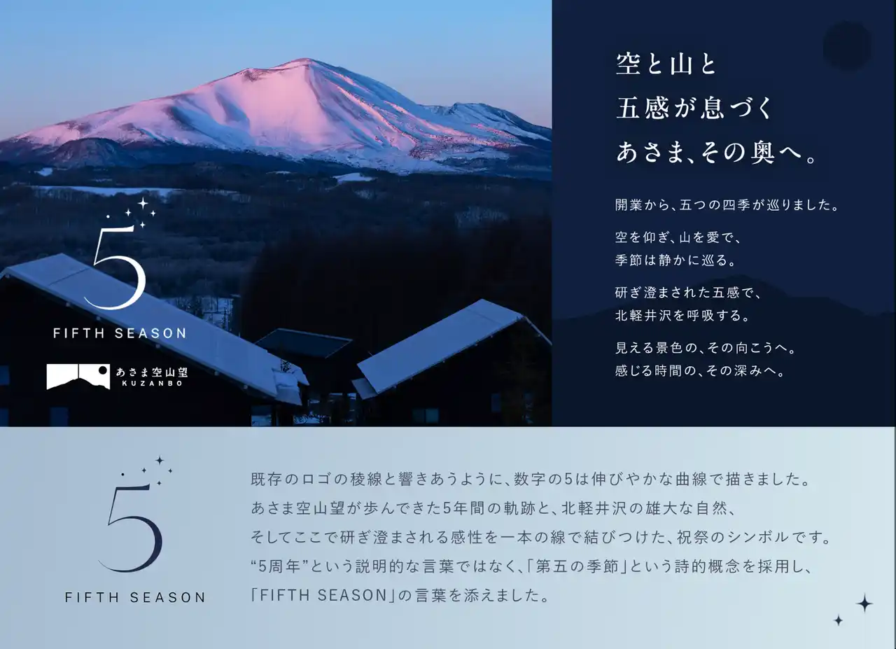 | あさま空山望は2026年4月26日(日)に開業5周年を迎えます。アニバーサリーイヤーのコンセプトとして、「空と山と、五感が、息づくあさま、その奥へ。」を掲げました。1年を通し、北軽井沢の自然や季節を五感で楽しむ体験をお届けしてまいります。ぜひご期待ください。 | |||
