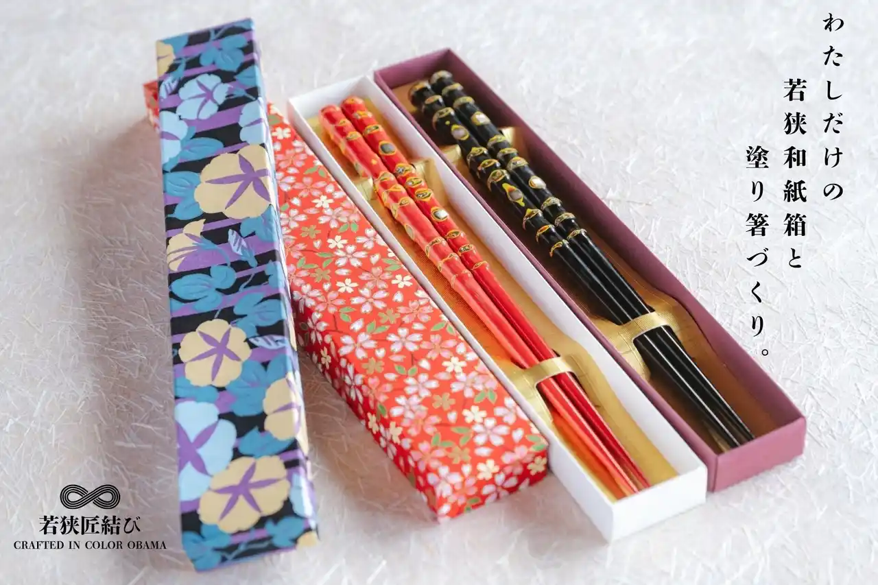 有限会社高鳥紙業(福井県小浜市/代表:高鳥義雄)は、2026年4月22日(水)より、福井県小浜市の伝統工芸を体験型プロジェクトとして提供する地域工芸ツーリズムプロジェクト「CRAFTED IN COLOR OBAMA(若狭匠結び)」を開始いたします。第1弾プロジェクトは「若狭塗り箸削り × 若狭和紙箱づくり体験」(税込5,500円/約2時間)。開始を記念し、小浜市在住の方を対象に先着50名様を無料でご招待します。体験後には小浜市内の観光スポットを巡る回遊プランもご案内し、工芸体験をきっかけに小浜のまち全体の魅力を体感いただけます。 |