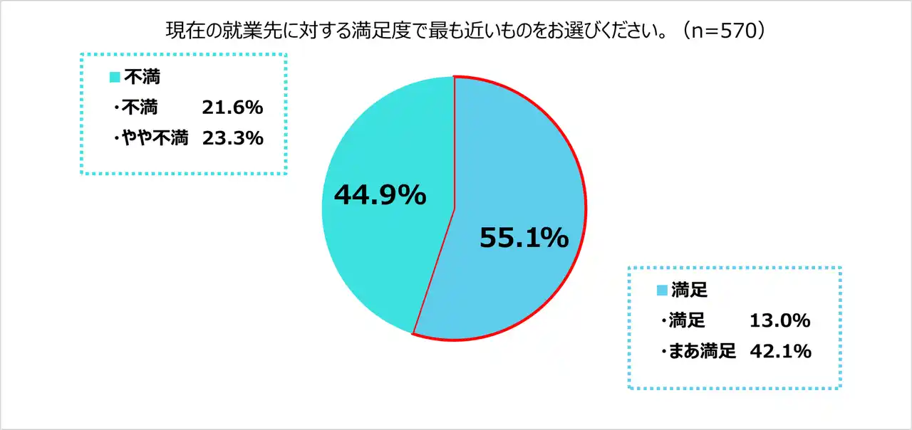 満足している層が多いものの、「まあ満足(42.1%)」が多く、「満足(13.0%)」と回答した人は、不満系である「不満(21.6%)」や「やや不満(23.3%)」を下回る結果となった。 |