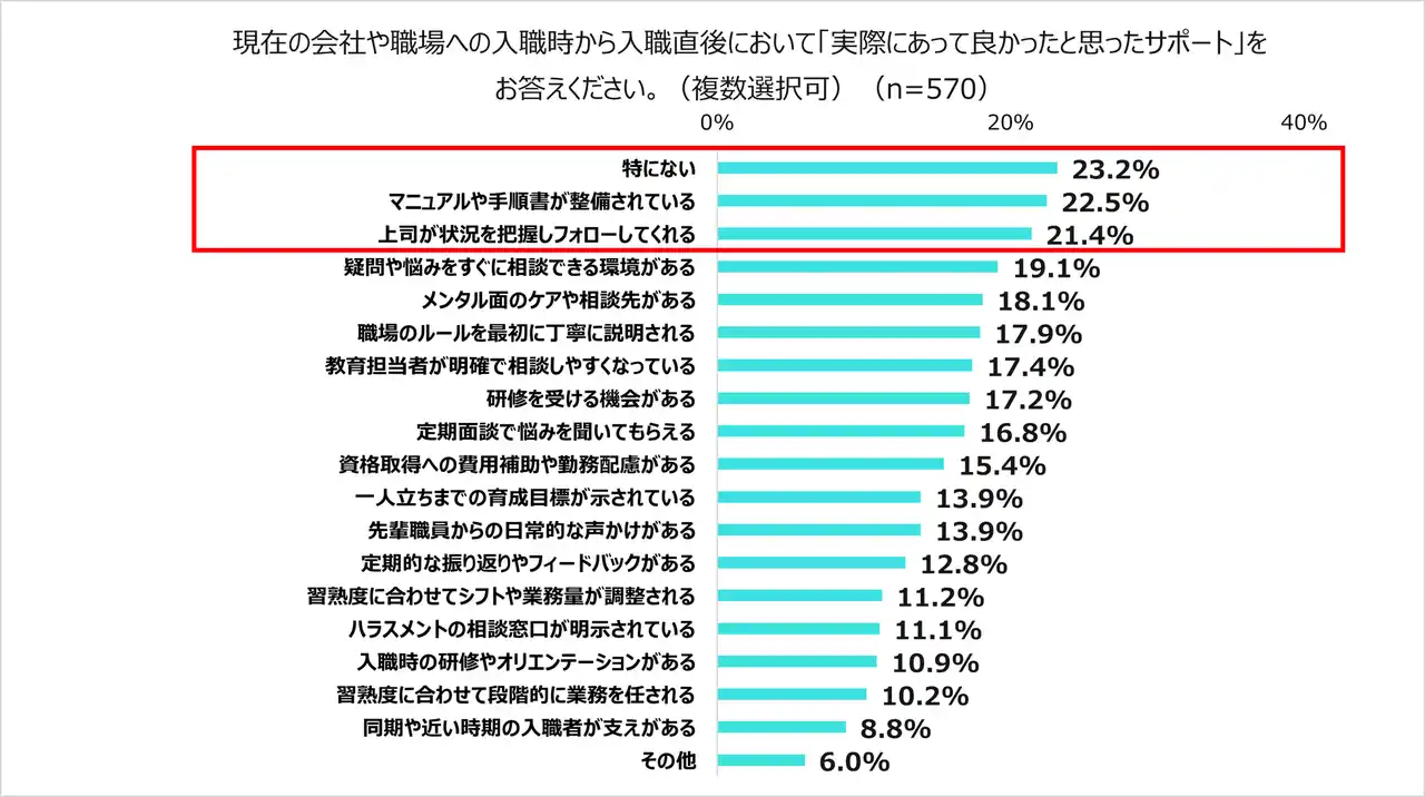・入職直後の「あって良かったサポート」の上位は「マニュアルや手順書が整備されている(22.5%)」、「上司が状況を把握しフォローしてくれる(21.4%)」など |