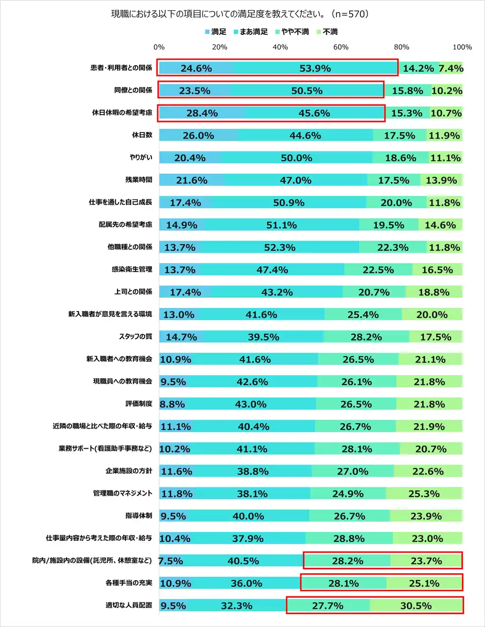 4、現職場での満足度が高いトップ3は「患者・利用者との関係(78.5%)」、「同僚との関係(74.0%)」、「休日休暇の希望考慮(74.0%)」 |