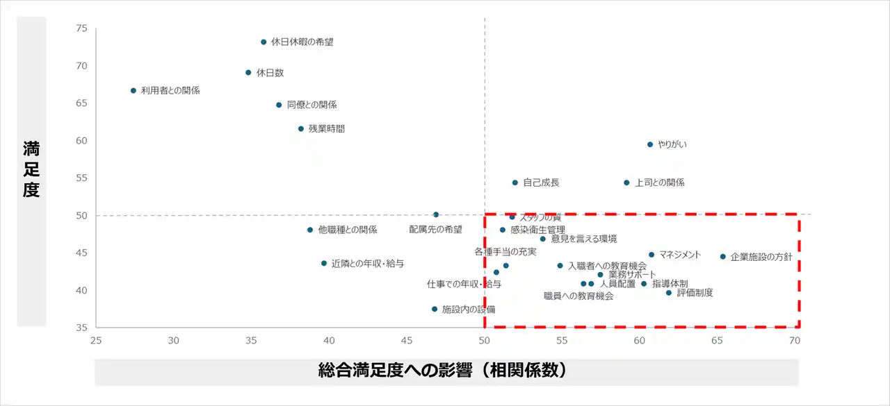 今回の調査でも、介護現場ではまだ入職時のサポートが十分ではないという回答や、「実際にあって良かったサポート」が「特になかった」といった回答も見受けられました。また、「企業施設の方針」、「評価制度」、「管理職のマネジメント」などの項目は総合満足度への影響は大きいものの、満足度は低い項目であり、介護従事者の離職防止に向けては、組織としての方針を明確にし、評価の納得感を高めるといった運営面での仕組みづくりが重要であることが示唆されました。介護従事者一人一人が満足度高く勤務を継続できる環境を整えるため、当社も引き続き支援を行ってまいります。 |