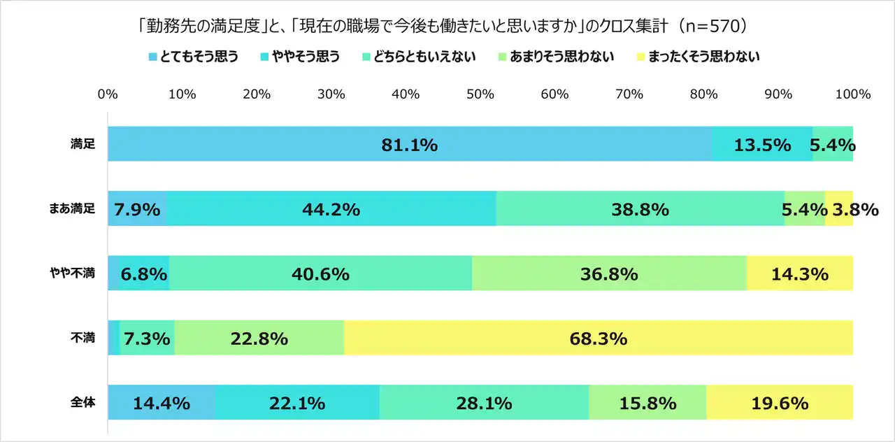 ※「勤務先の満足度」は縦軸(「満足」等)で掲示、「現在の職場で今後も働きたいと思いますか」は「とてもそう思う」等のパーセンテージで掲示 |