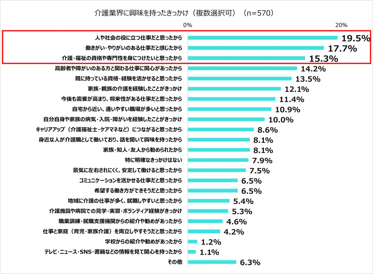 ・介護従事者が介護業界に興味を持ったきっかけの1位は「人や社会の役に立つ仕事だと思ったから(19.5%)」 |