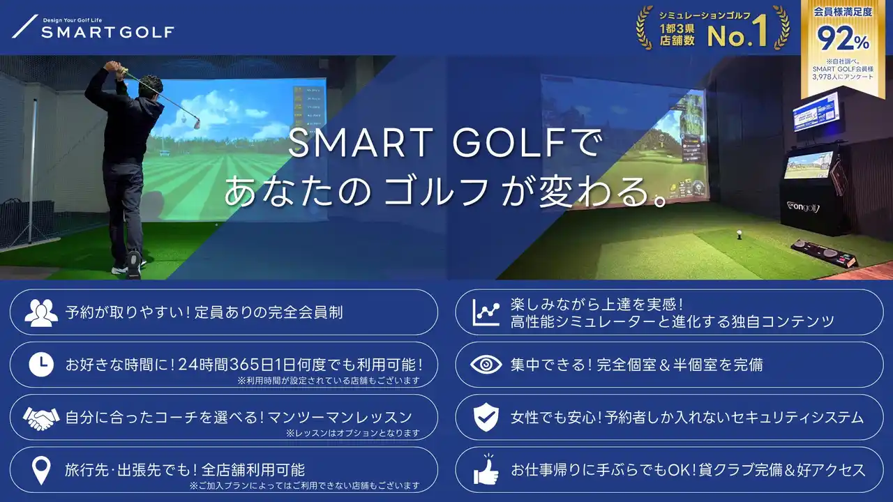 SMART GOLFは、定額制 / 完全会員制 / 通い放題の最新シミュレーター付きインドアゴルフ練習場で、初心者~トッププロまで幅広い層にご利用いただいております。 |