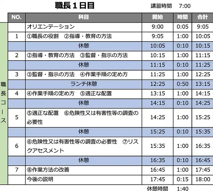 建設業、製造業(一部除く)、電気、ガス、機械修理業、自動車整備業、食料品製造業(うまみ調味料製造業及び動植物油脂製造業は、すでに対象)」、「新聞業、出版業、製本業及び印刷物加工業」など教育が必要な業種の選任される予定の方対象に、 必要な知識と実務能力を習得していただくため、学科12時間のカリキュラムによる講習です。 ※厚生労働省の教育実施要領に基づいた学科12時間の修了証を3営業日を目安に発行します。 |