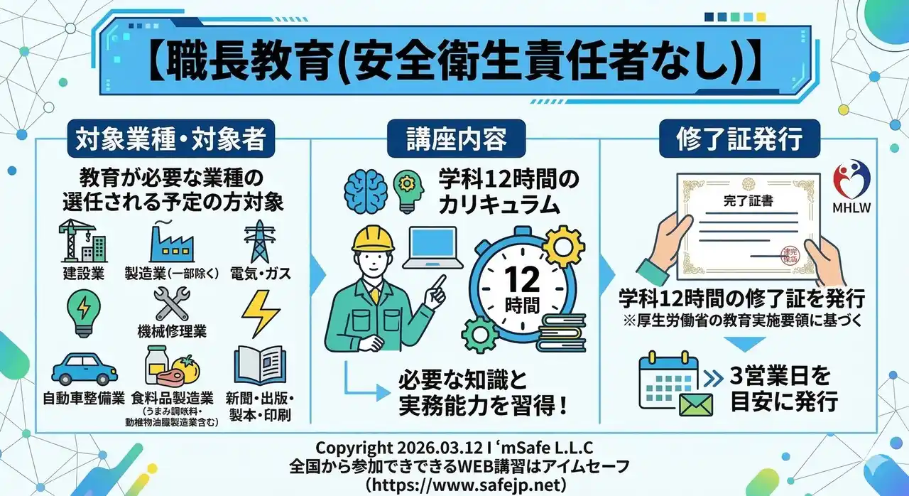 | アイムセーフ合同会社では、厚生労働省通達による【職長教育(安全衛生責任者なし)】を社内や自宅から受講できる便利なオンライン講習会で実施しています。 | |||||||