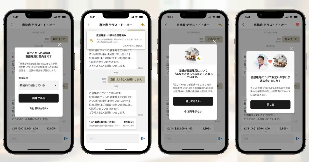 シェフ・飲食事業者の双方が採用に前向きな意向を示した場合、意向が一致したことを双方に分かりやすく伝えるUIを表示し、スムーズなコミュニケーションを促進します。 |