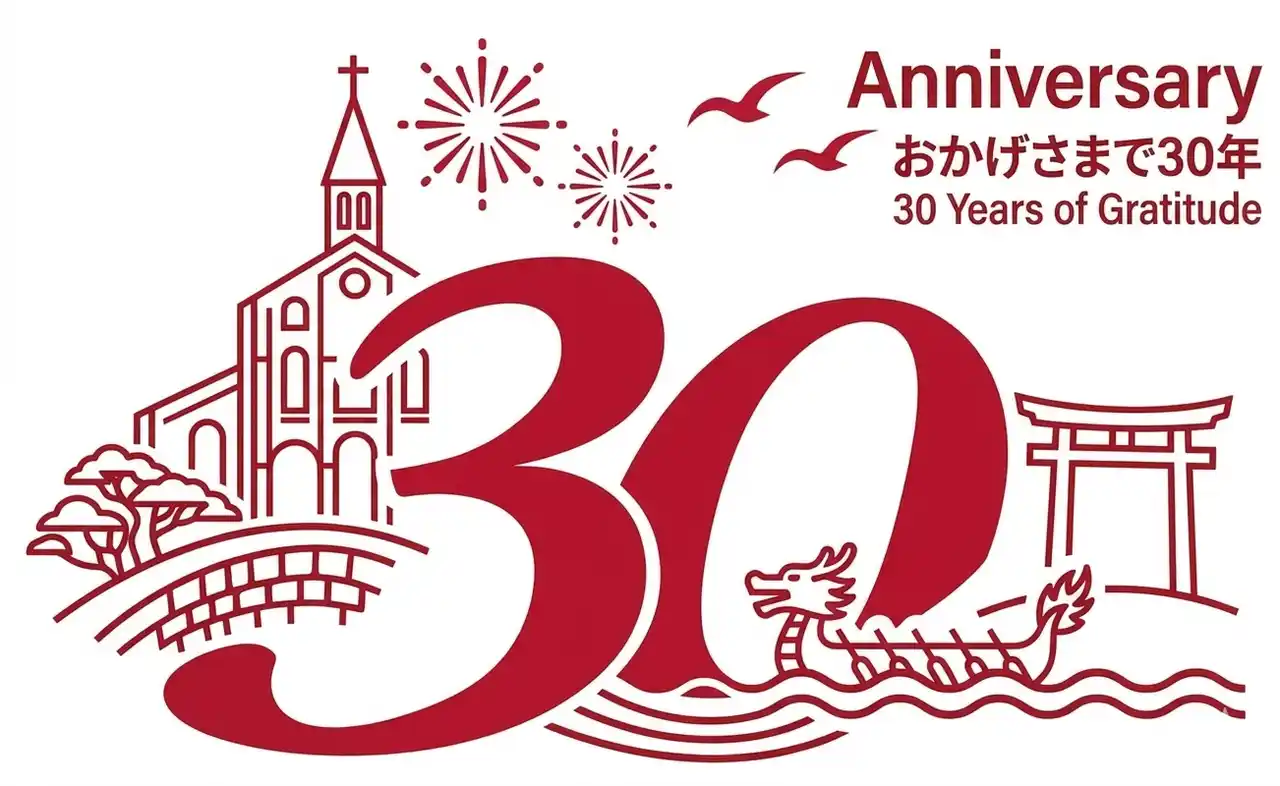 | 開業30周年記念ロゴには、長崎の伝統行事「ペーロン」をモチーフにした船を中心に、異国文化が交わる街を象徴する教会や鳥居、そして夜空に咲く花火を描いています。 | |||||