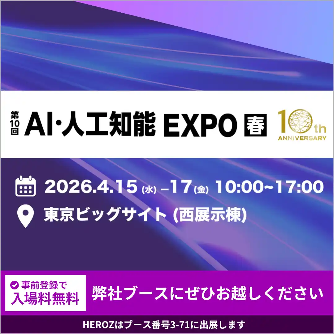 HEROZ株式会社(本社:東京都港区、代表取締役CEO:林 隆弘、以下「HEROZ」)は、2026年4月15日(水)から4月17日(金)まで東京ビッグサイトで開催される「第10回 AI・人工知能 EXPO【春】」に出展いたします。本展示会はAI技術に特化した展示会で、国内外の企業が集結し、最新技術や製品が発表され、AI技術のトレンドを知る絶好の機会となっています。HEROZは、「AI技術を通じて社会に貢献する」というミッションのもと、日々技術開発に取り組んでいます。本展示会を通じて、AI技術の可能性を広く知っていただき、企業や個人が抱える課題解決の一助となることを目指します。また、来場者の皆様との対話を通じて、さらなる技術革新のヒントを得ることを期待しています。 |