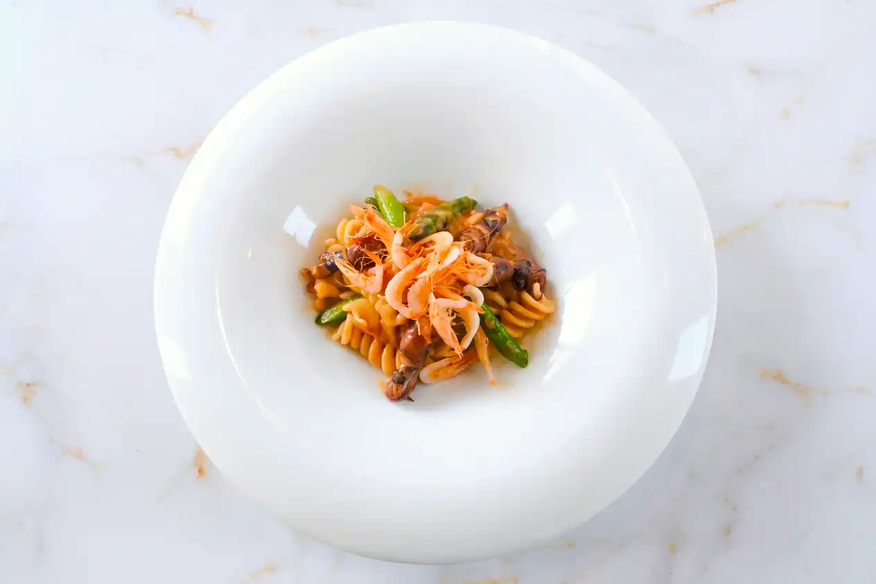 「今回の春メニューは、“彩と香り”をテーマに構成しました。 春は、食材そのものが持つ色の美しさと、やわらかく広がる香りに心が動く季節だと感じています。ひと皿ごとに、春らしい鮮やかさと、口に運ぶ前から感じられる香りの印象を大切に仕立てました。前菜のテリーヌは、春野菜の彩りの美しさと、旬を迎える鰆の旨みが調和する一皿です。見た目の華やかさだけでなく、素材それぞれの持ち味がやさしく重なり合うよう意識しました。パスタは、ホタルイカ、桜海老、アスパラを合わせ、ソースにはトマトと生クリームではなく、カリフラワーとトマトを使うことで、春らしい軽やかさとやさしい奥行きを表現しています。アスパラのシャキシャキとした食感もアクセントになっています。 |