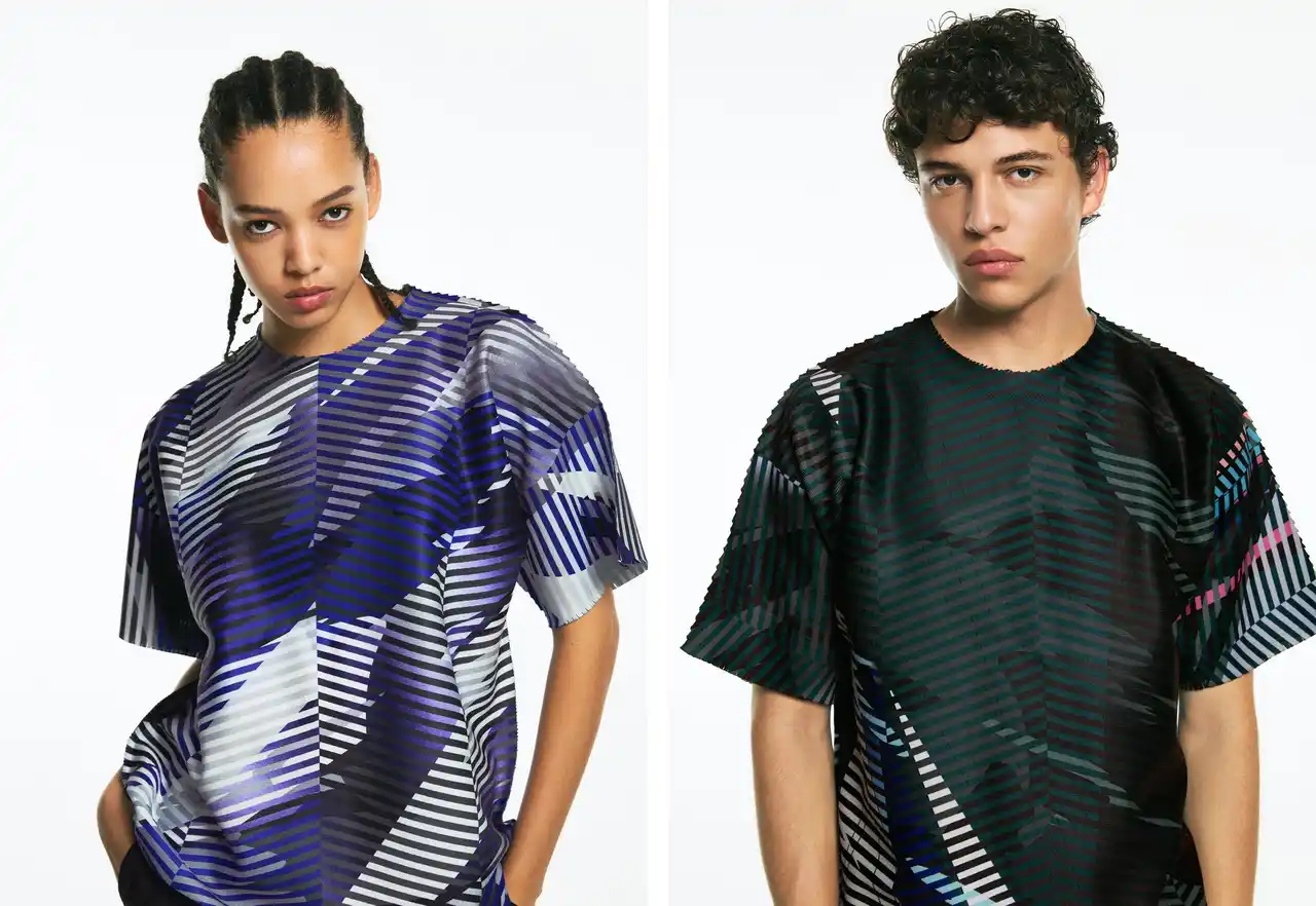 単に衣服にグラフィックを載せるのではなく、A-POC ABLE ISSEY MIYAKEの立体的な服づくりと独自のプリーツ技術「Baked Stretch」の製作プロセスを前提に、身体の動きや視点の変化によって美が立ち現れるよう、グラフィックは数多くのパターン検証を重ねながら緻密に設計されています。これらは固定された美ではなく、動きの中で現れる「瞬間の造形」として、新しい美の可能性を提示します。 |