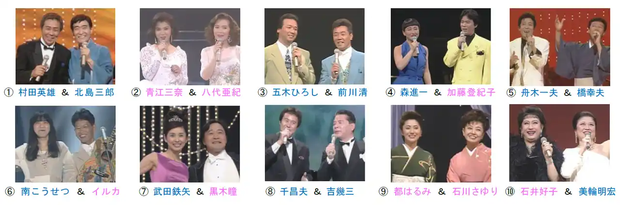 二人の歌手だけで進行するのは、通常の番組と違いとても新鮮で、先輩、後輩、動機、時にはライバルといった組み合わせは、“出て楽しい”“見て楽しい”番組でした。私も何回か出演させていただきましたが、やはり思い出深いのは村田英雄さんです。久しぶりに一緒に歌って嬉しかったですし、進行を乱して先輩に迷惑かけないよう緊張もしました。また後輩とのステージでは彼らが遠慮したり委縮したりすることのないよう心掛けたり、色々と思い出があります。なにより自分たちが楽しんでやることで、目の前のお客様が喜んでくれて、
