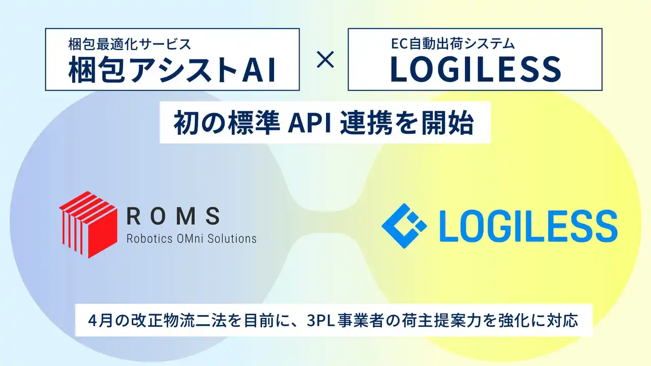 物流倉庫や工場向けに自動化ソリューションを提供する株式会社ROMS(本社:東京都品川区、代表取締役:前野洋介)は、自社の提供する梱包最適化サービス「梱包アシストAI」において、株式会社ロジレス(本社:東京都品川区、代表取締役CEO:田中稔之)が提供するEC自動出荷システム『LOGILESS(ロジレス)』とのAPI連携を開始したことをお知らせいたします。 |