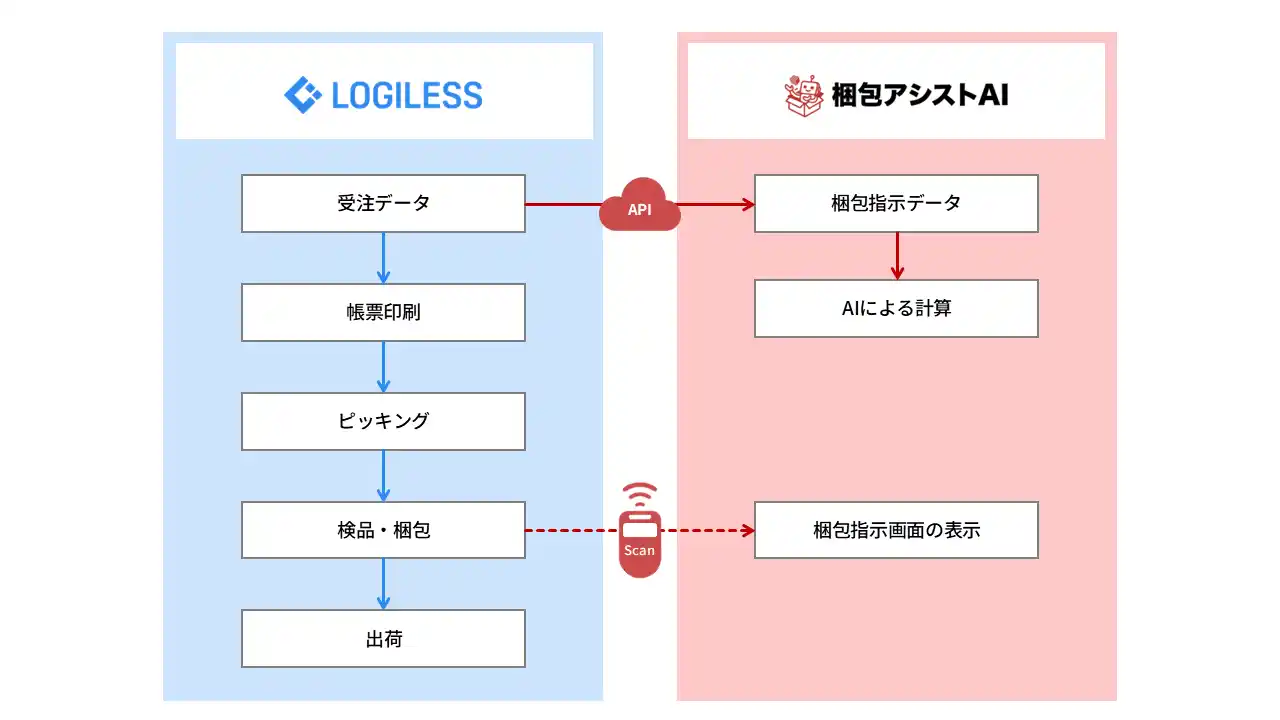 今回のAPI連携により、『LOGILESS』をご利用中のユーザー様は、以下のフローで自動的に最適な梱包シミュレーションを実行できます。 |