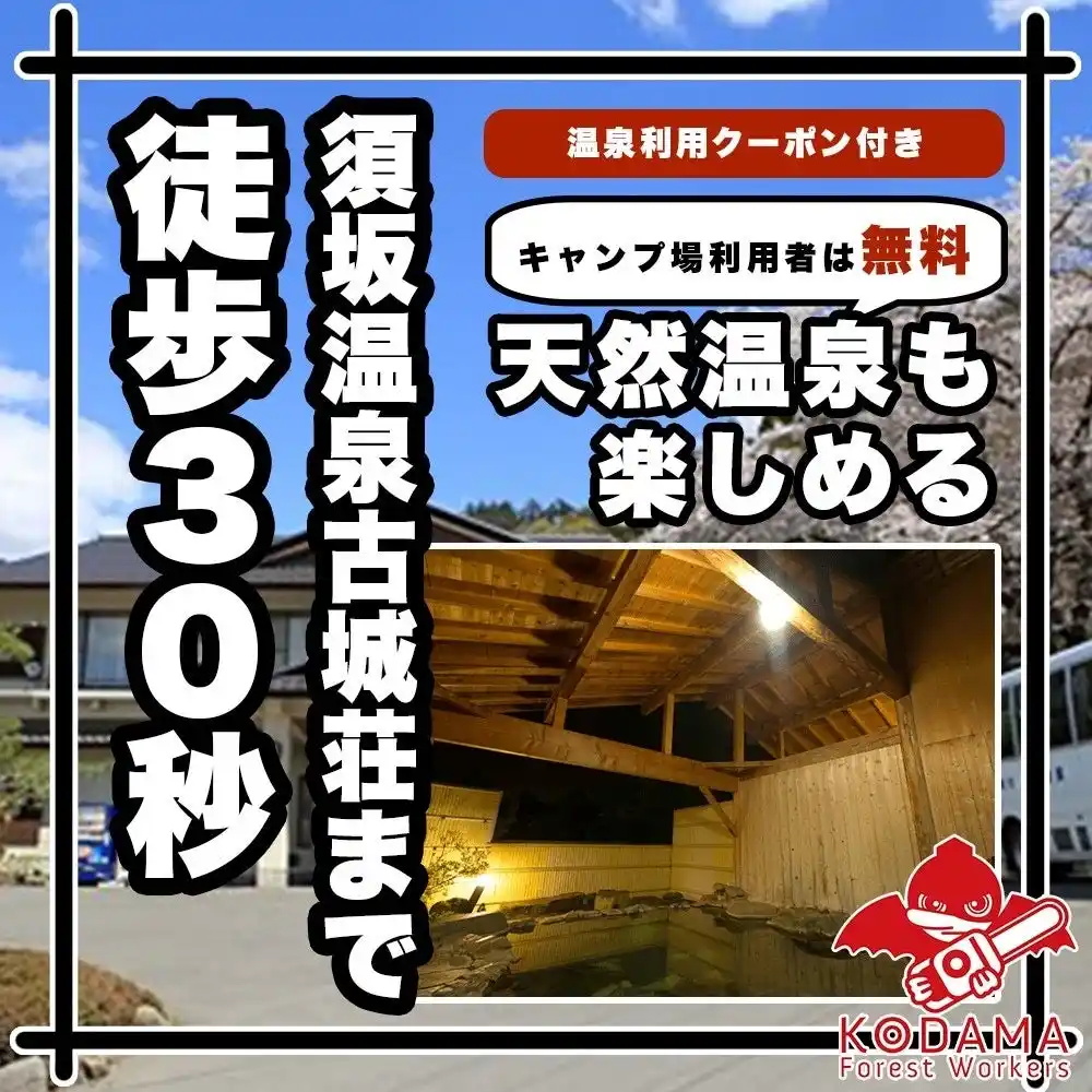 隣接する「須坂温泉古城荘」の協力により、チェックインからアウトまで温泉入り放題を実現。焚き火の匂いを朝風呂でさっぱり流せるのは、当キャンプ場ならではの贅沢です。また、夏場は県内最大級のスライダーを誇る「サマーランド」まで徒歩1分~2分。ソロ利用はもちろん、家族全員が満足できるアクティビティが揃っています。 |