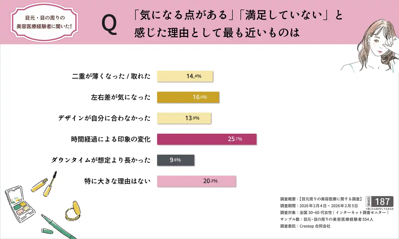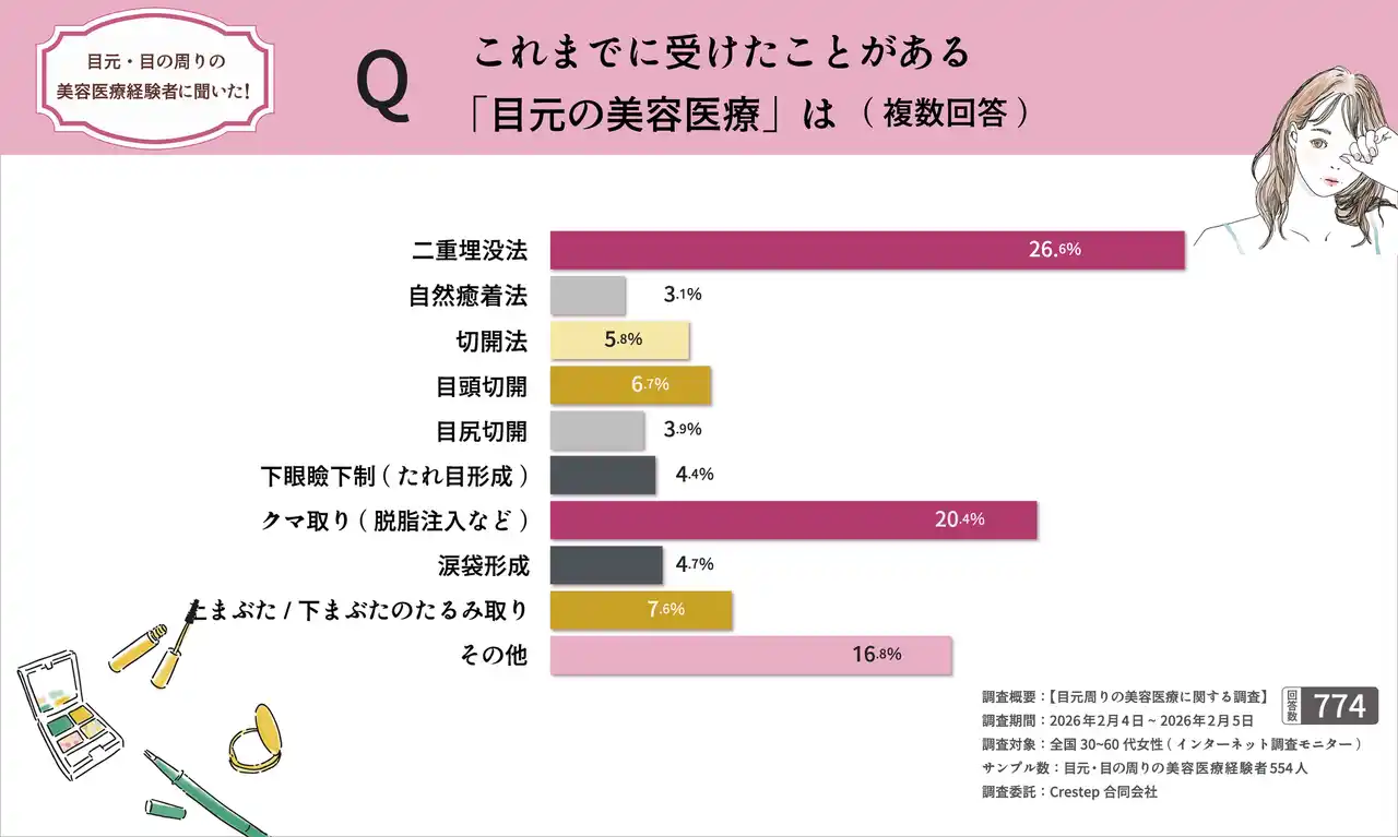 調査名:【目元周りの美容医療に関する調査】 調査期間:2026年2月4日~2026年2月5日 調査対象:全国/30~60代/女性(インターネット調査モニター) 有効回答数:目元・目の周りの美容医療経験者554人 調査実施:Crestep合同会社 |