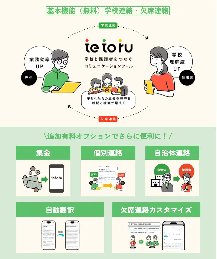 ▽tetoruについて tetoruは「学校からの連絡配信機能」「保護者からの欠席連絡機能」を基本機能として搭載した小中学校向け保護者連絡サービスです。公立学校、自治体が導入する場合は基本機能を無料でご利用いただけるため、自治体単位での一括導入がしやすくなっています。また、校務支援システムとの連携により、学校のDX推進を支援します。 |