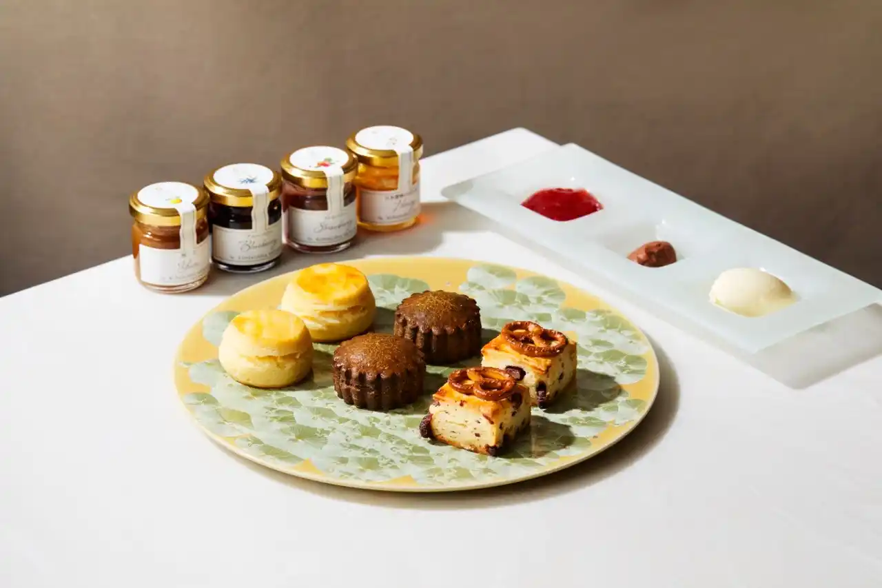 スコーンは、「チョコレートプレッツェル」と「クラシック」「チャイ」の3種類です。「チョコレートプレッツェル」にはピエール マルコリーニのショコラを使用し、プレッツェル特有の塩味と食感が際立ちます。「クラシック」はバターの風味豊かな定番の味わい、「チャイ」はスパイスの風味を生かしました。コンディメントには、ピエール マルコリーニのショコラを使ったチョコレートカード、クロテッドクリームのほか、ストロベリージャム、ブルーベリージャム、柚子マーマレード、日本ミツバチのはちみつの中からお一つお選びいただけます。 |