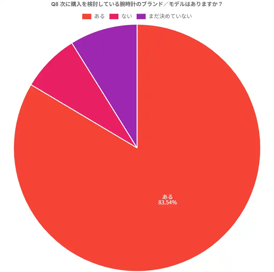 『直近の売却代金の主な使い道は?』の問いで「別の腕時計の購入(買い替え)」と回答した層に対し、次に購入を検討している腕時計のブランド/モデルを尋ねたところ、「ある」83.54%が最多となりました。 |