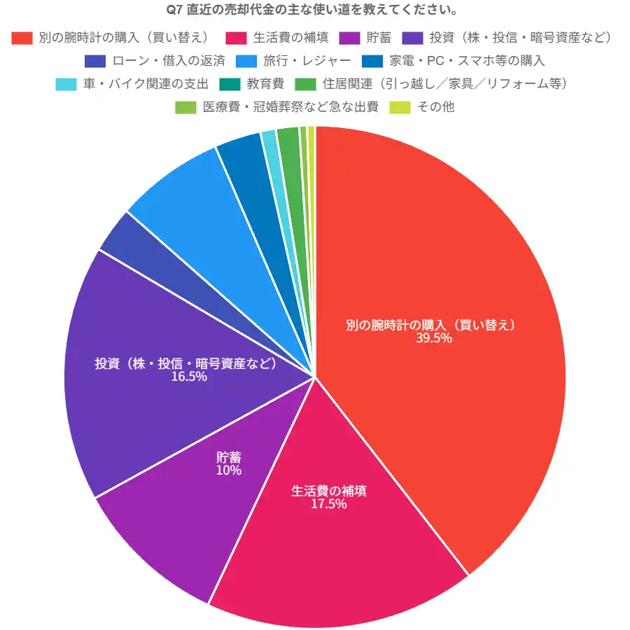 直近の売却代金の主な使い道は、「別の腕時計の購入(買い替え)」39.5%が最多。次いで「生活費の補填」17.5%、「投資(株・投信・暗号資産など)」16.5%。 |