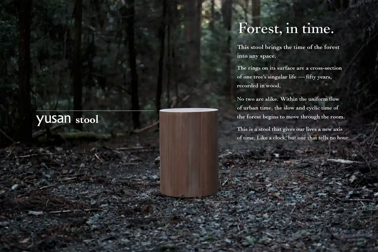 徳島発カルチャーブランドyusanは、世界最大級の国際家具・インテリア見本市のミラノデザインウィーク2026にて<yusan stoolーForest,in time.>を発表します。 丸太を輪切りにすることで木が生きた時間を表出させた本製品は、放置林の価値を見直すきっかけを作ります。 |