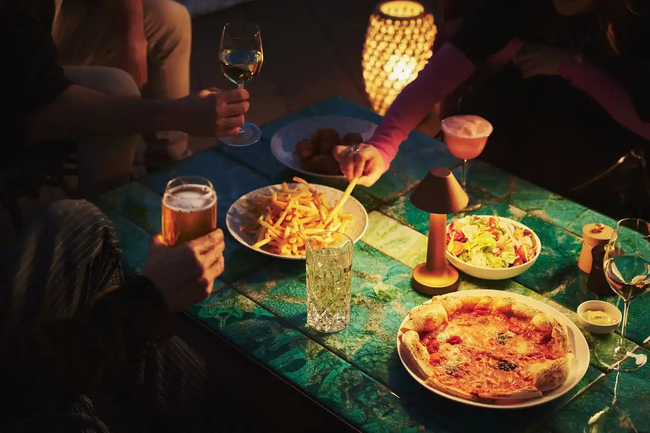 ナポリ出身のエグゼクティブシェフ ダビデ・ディ・ディオが手掛けるピザマルゲリータ、その他にも外は香ばしく、中はジューシーに仕上げた鶏の唐揚げをローストガーリックの深みと柚子胡椒のアクセントを効かせたダビデ特製ソースを合わせてご提供。いずれもビールとの相性は抜群です。 |