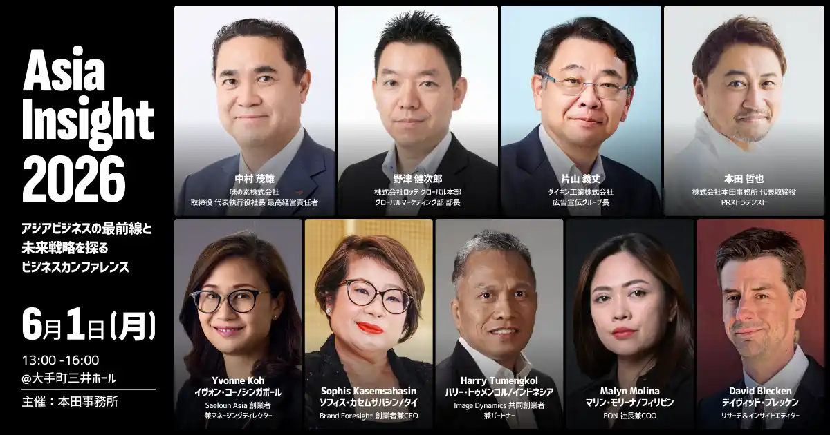 株式会社本田事務所(代表取締役:本田哲也、本社:東京都港区)は、日本企業のアジア進出を支援するコレクティブネットワーク「PR Collective Asia」の発足を記念し、2026年6月1日(月)13時~16時、大手町三井ホールにて、日本企業のアジアビジネスの最前線と未来戦略を考えるビジネスカンファレンス『Asia Insight 2026』を開催いたします。 |