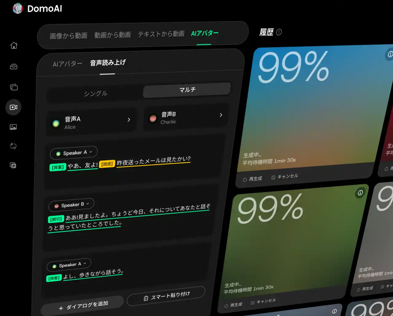 AI動画・画像生成プラットフォーム「DomoAI」を運営するDomoAI PTE. LTD(本社:シンガポール、CEO:Joe Lam、以下「DomoAI(ドモエイアイ)」)は、「トーキングアバター」機能のアップデートを行い、提供を開始しました。本アップデートにより、音声・感情・会話表現が強化され、従来の動画生成に加え、ストーリー性や演出を伴うコンテンツ制作が可能となります。さらに、生成から演出、会話までを一連の流れとして制作できるようになりました。これに伴い、キャラクターが動き、話す動画制作を一体的に行える環境を提供します。 |