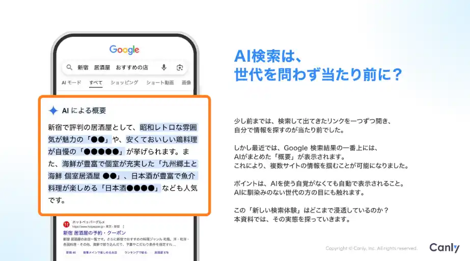 | しかし最近では、検索結果の一番上に自動で表示される「AIによる概要」を参考にお店を選ぶ方がが増えているのをご存知でしょうか。 | |||||||||