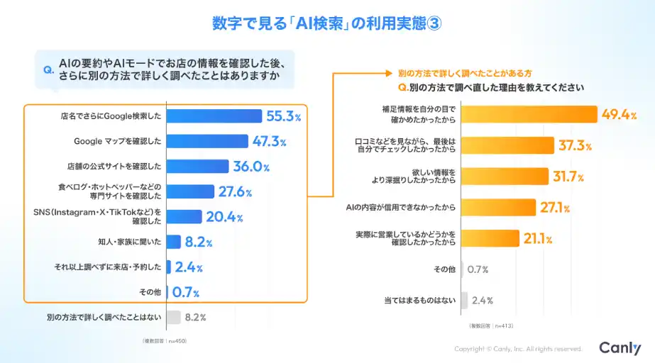 | さらに、利用者の多くはAIの情報だけで完結せず、「情報の正確性」を確かめるために、別の方法で調べ直すという行動を取っている実態もわかりました。 | |||||||||