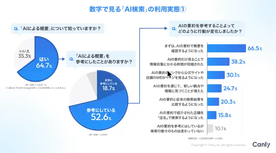 | 調査の結果、AIによる概要を認知している方のうち、70%以上が参考にしている実態が明らかに。 | |||||||||